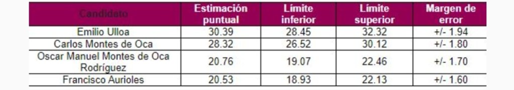 En el ejercicio estadístico que implicó el levantamiento de 4 mil 783 cuestionarios –cara a cara–, Emilio Ulloa Pérez obtuvo 30.39 por ciento de las preferencias, mientras que los candidatos a la Presidencia de Morena, Porfirio Muñoz Ledo y Mario Delgado, obtuvo cada uno 25 por ciento de las preferencias, mientras que la senadora Citlalli Hernández, quien por el criterio de Equidad de Género ocuparía la Secretaría General, por el simple hecho de ser mujer, obtuvo 21 por ciento de las preferencias.