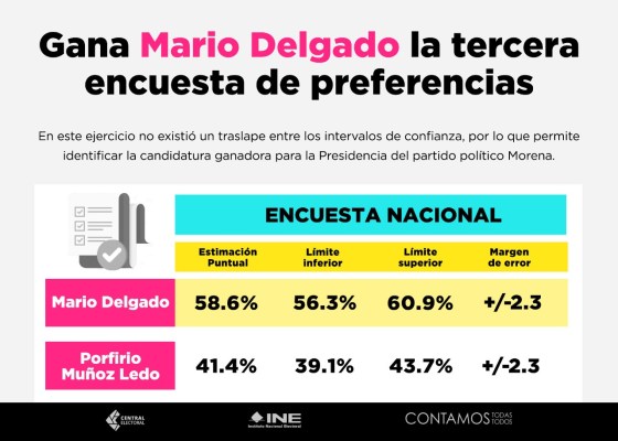 Gana Mario Delgado la tercera encuesta con 58.6% de preferencias para la dirigencia de Morena. El Instituto Nacional Electoral publicó