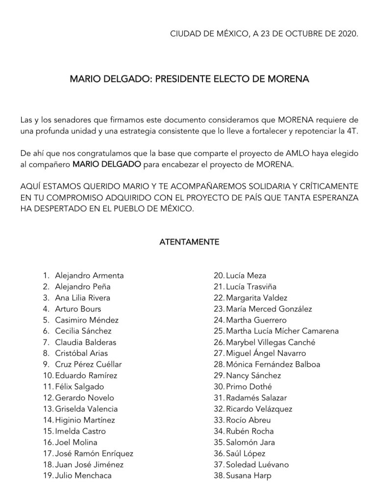 23/10/2020 NACIONAL LAS Y LOS SENADORES DE MORENA RESPALDAN A MARIO DELGADO COMO NUEVO LÍDER DE ESTE PARTIDO POLÍTICO Publicado por Redacción Compártir Haz clic para compartir en Facebook (Se abre en una ventana nueva) Facebook Haz clic para compartir en X (Se abre en una ventana nueva) X Haz clic para compartir en WhatsApp (Se abre en una ventana nueva) WhatsApp Relacionado