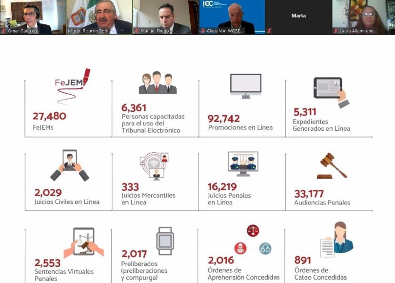 El titular del Tribunal mexiquense participó en la charla vía Zoom ¿Justicia Digital en México: Experiencia y Proyección?, organizada por el capítulo mexicano de la Cámara Internacional de Comercio (ICC, por sus siglas en inglés) en la que conversó con Omar Guerrero Rodríguez, socio del prestigiado despacho internacional Hogan Lovells, el director de ICC México, Claus Von Wobeser, magistrados federales y abogados.