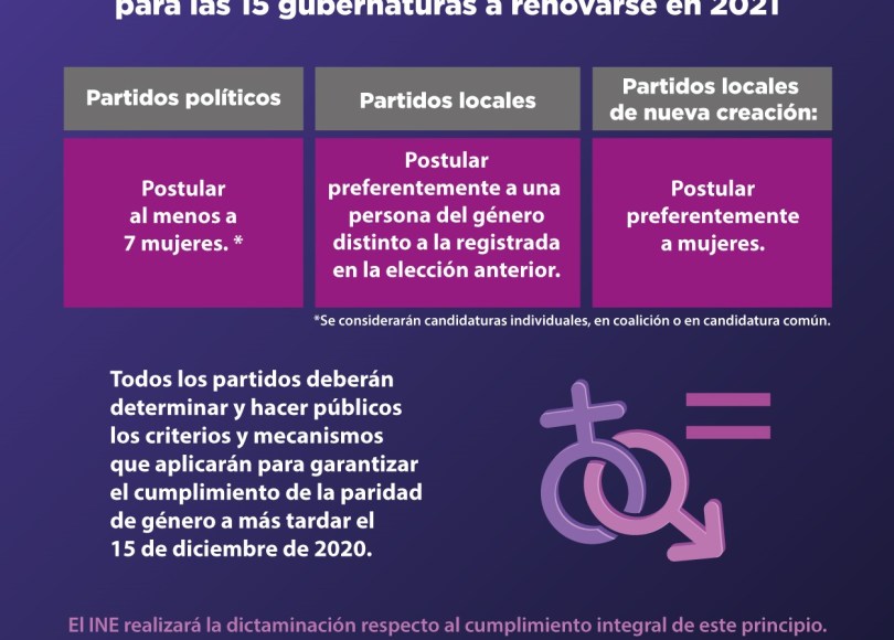 La dictaminación de cumplimiento integral del principio de paridad de género en las candidaturas a Gubernaturas en el Proceso Electoral 2020-2021 se dará de forma exclusiva por el INE a más tardar el 2 de abril de 2021.