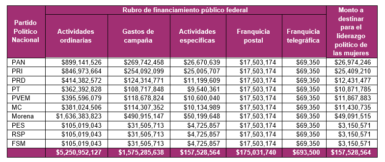 La Consejera Claudia Zavala precisó que una vez que se tuvo certeza del número total de partidos políticos nacionales, se determinó la distribución del financiamiento público federal, incluido el de actividades ordinarias y específicas, gastos de campaña, el monto a destinar para el liderazgo político de las mujeres, franquicia postal y telegráfica.