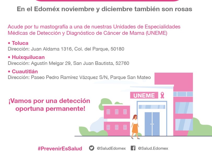 A través del Instituto de Salud del Estado de México (ISEM) y en coordinación con las 19 Jurisdicciones Sanitarias se llevará a cabo esta importante tarea, a fin de prevenir, detectar y atender a tiempo el cáncer de mama, que se ubica entre las primeras causas de muerte entre este sector de la sociedad.
