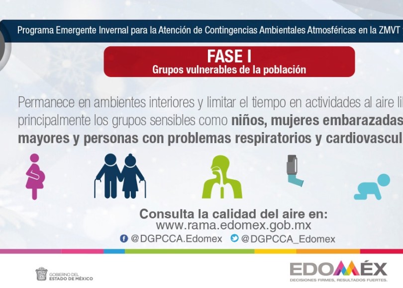 La Secretaría del Medio Ambiente del Gobierno del Estado de México (SMA), a través de la Dirección General de Prevención y Control de la Contaminación Atmosférica (DGPCCA), informa que se activan acciones en Fase I de Contingencia Ambiental Atmosférica por partículas en las Zonas Metropolitanas del Valle de Toluca (ZMVT) y Santiago Tianguistenco.