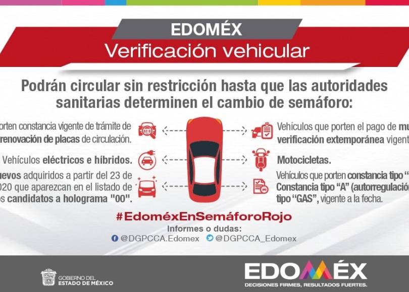 Además, podrán circular hasta en tanto las autoridades competentes reanuden las actividades, los vehículos nuevos que hayan sido adquiridos a partir del 23 de marzo de 2020, así como los vehículos nuevos que no cuentan con verificación vehicular correspondiente al año 2020, los cuales aparecen en el listado de vehículos candidatos al holograma “00” a partir del año 2020 (dicho listado es actualizado por la Secretaría del Medio Ambiente) localizado en la página electrónica https://sma.edomex.gob.mx/verificacion_vehicular.