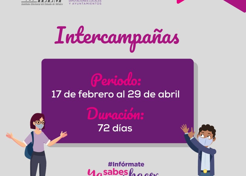 Continuando con el avance del calendario electoral aprobado por el Instituto Electoral del Estado de México (IEEM), se destaca que, una vez concluido el periodo de precampañas, da inicio la etapa conocida como intercamapañas que va del 17 de febrero al 29 de abril en donde los partidos políticos, afinan los últimos detalles para la selección de candidaturas, asimismo no podrán realizar actos de proselitismo o hacer un llamado al voto.