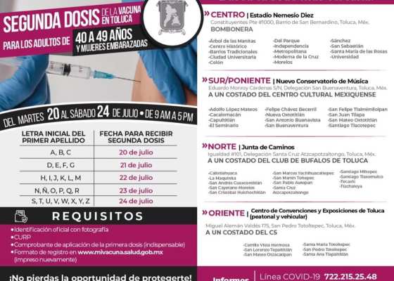 Son #Huixquilucan, #Metepec, #Zinacantepec, #Lerma, #SanMateoAtenco y #Toluca las demarcaciones donde se completará el esquema. Informan que también vacunarán a