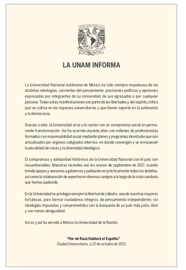 Al interior de la Gaceta UNAM también se exhibe una carta escrita desde el pasado 22 de octubre cuando Lopez Obrador comenzó a descalificarlos.