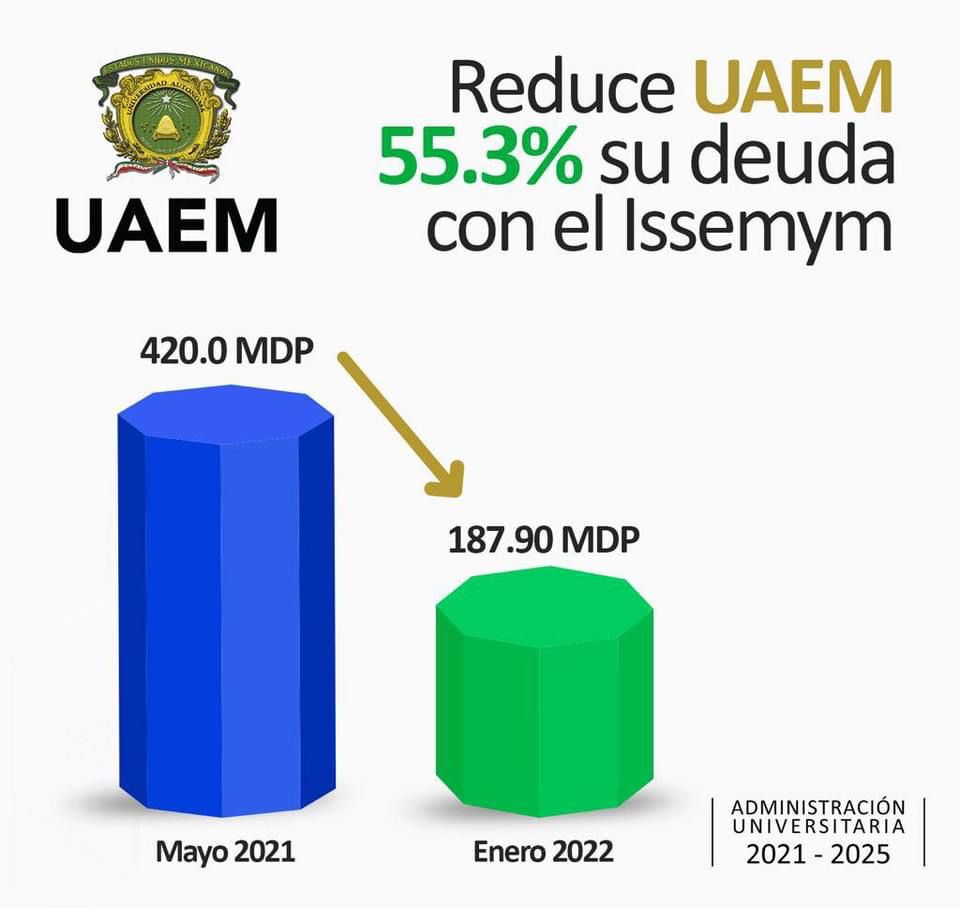 A ocho meses de la Administración 2021-2025 de la Universidad Autónoma del Estado de México (UAEMéx) se alcanzó la reducción de 55.3 por ciento de la deuda con el Instituto de Seguridad Social del Estado de México y Municipios (ISSEMyM) gracias a las acciones de ahorro y el adecuado manejo de los recursos acorde a las políticas de transparencia y rendición de cuentas.