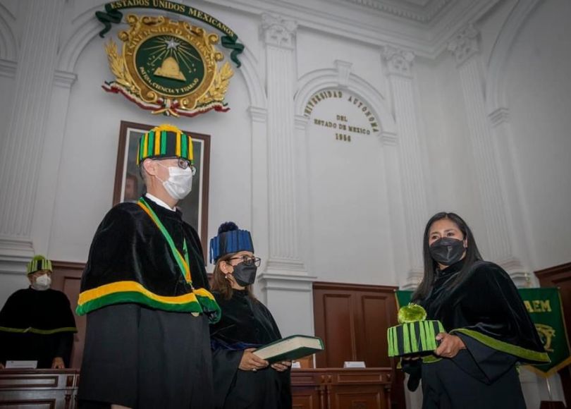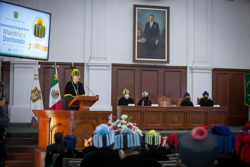 A la Ceremonia de Entrega de Grado Maestría y Doctorado Primavera 2022 acudieron el director de Investigación de la UAEMéx, Juan Roberto Calderón Maya; la graduada de doctorado con mejor promedio Mayra Rodríguez Peña, integrantes del Gabinete Universitario, Colegio de Directores y comunidad universitaria en general.