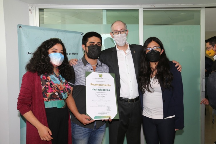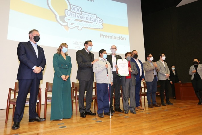 Acompañado del titular de la Secretaría de Desarrollo Económico en la entidad, Pablo Peralta García; la directora del Instituto Mexiquense del Emprendedor, Anahy Ramírez Vilchis; el director general del Consejo Mexiquense de Ciencia y Tecnología, Bernardo Almaraz Calderón; el secretario de Extensión y Vinculación de la UAEMéx, Francisco Zepeda Mondragón; el vicepresidente de la Fundación UAEMéx, Heberto Guzmán Gómez, y el emprendedor Hugo Arián Marín Tapia, el rector de la Autónoma mexiquense entregó los premios a los ganadores.