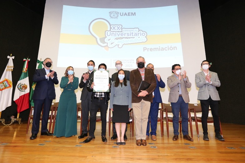 Acompañado del titular de la Secretaría de Desarrollo Económico en la entidad, Pablo Peralta García; la directora del Instituto Mexiquense del Emprendedor, Anahy Ramírez Vilchis; el director general del Consejo Mexiquense de Ciencia y Tecnología, Bernardo Almaraz Calderón; el secretario de Extensión y Vinculación de la UAEMéx, Francisco Zepeda Mondragón; el vicepresidente de la Fundación UAEMéx, Heberto Guzmán Gómez, y el emprendedor Hugo Arián Marín Tapia, el rector de la Autónoma mexiquense entregó los premios a los ganadores.