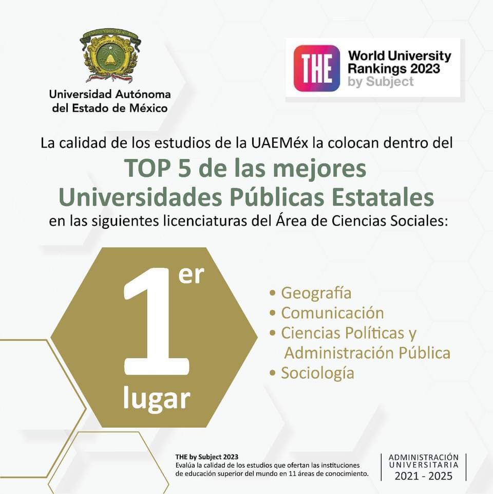 En el más reciente reporte del THE, la UAEMéx obtuvo el primer lugar en el área de Ciencias Sociales, en particular en los programas educativos de: Licenciatura en Geografía, Licenciatura de Comunicación, Licenciatura en Ciencias Políticas y Administración Pública, así como la Licenciatura en Sociología.