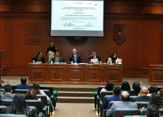 El rector de la UAEMéx, Carlos Eduardo Barrera Díaz, y el rector de la Universidad Europea del Atlántico, Rubén Calderón Iglesias, firmaron un convenio de colaboración.