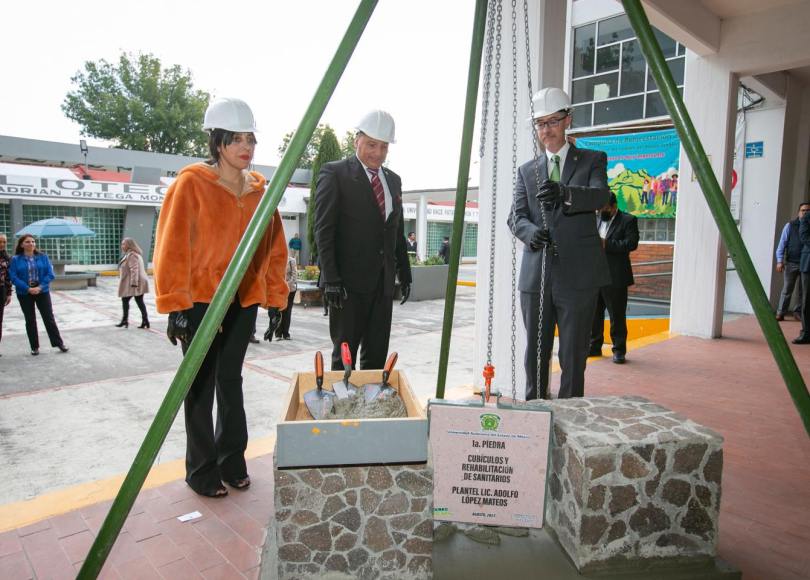 Con el objetivo fortalecer la calidad educativa de beneficio del estudiantado, el rector de la Universidad Autónoma del Estado de México (UAEMéx), Carlos Eduardo Barrera Díaz, entregó 15 pantallas de 65 pulgadas, 9 proyectores y colocó la primera piedra de tres cubículos para el profesorado; además, comenzaron los trabajos para la remodelación de los sanitarios del tercer piso del Plantel “Lic. Adolfo López Mateos” de la Escuela Preparatoria.