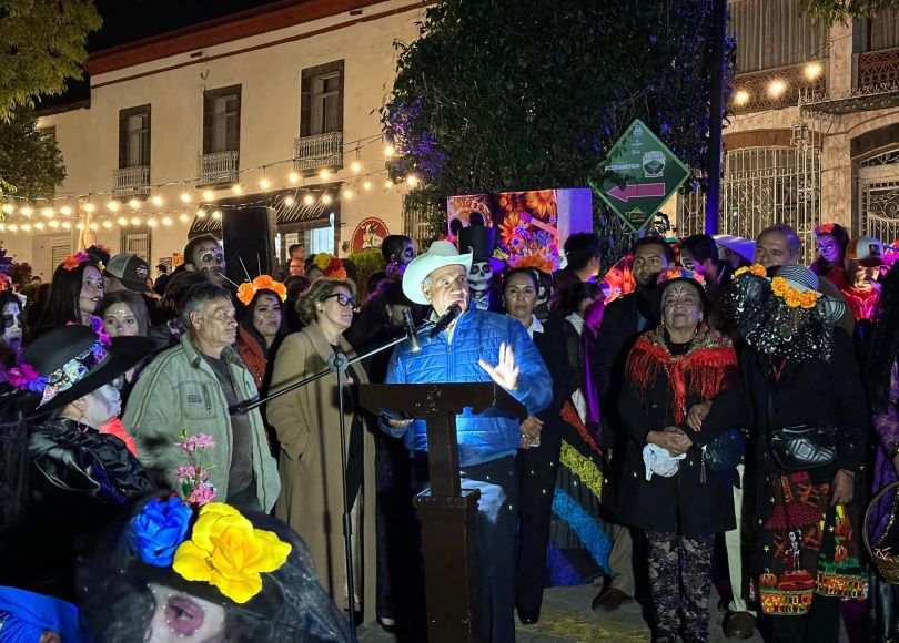 Se dispuso una ofrenda monumental en las escaleras de la Presidencia Municipal, implementada con platillos típicos de la región, las coloridas calaveritas, flores, papel picado, bebidas tradicionales. Llena de los colores que predominan en esta época, este altar representa la identidad mexicana, que año tras año se esfuerza por mantener viva esta celebración.