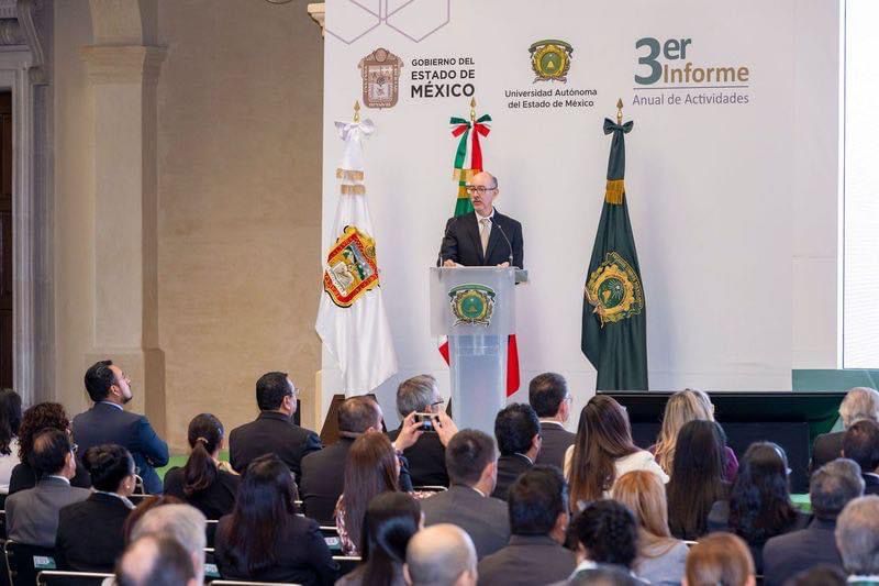 - El rector Carlos Eduardo Barrera Díaz dio lectura al tercer informe anual de actividades de la Administración 2021-2025 de la UAEMéx.