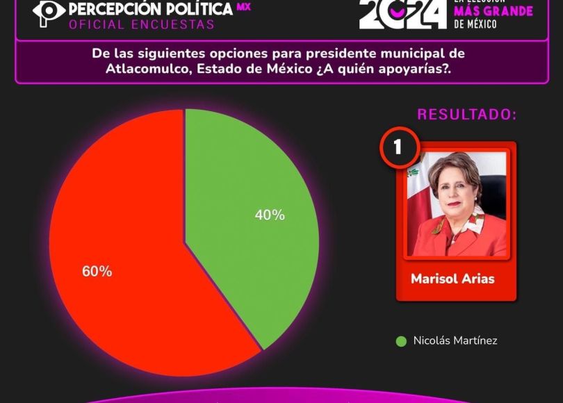 Rumbo a la elección de este 2 de junio, en Atlacomulco comienzan a realizarse dinámicas de medición para ofrecer un panorama sobre la simpatía en la gente y seguidores. En las últimas encuestas realizadas, la priista Marisol Arias encabeza en la preferencia de la ciudadanía como lo refleja esta última encuesta realizada por una plataforma dedicada a los sondeos y encuestas. Cabe señalar que la pasada administración en Atlacomulco fue de MORENA y los pobladores ya tienen marcos de referencia para mostrar su inclinación hacia una opción política.